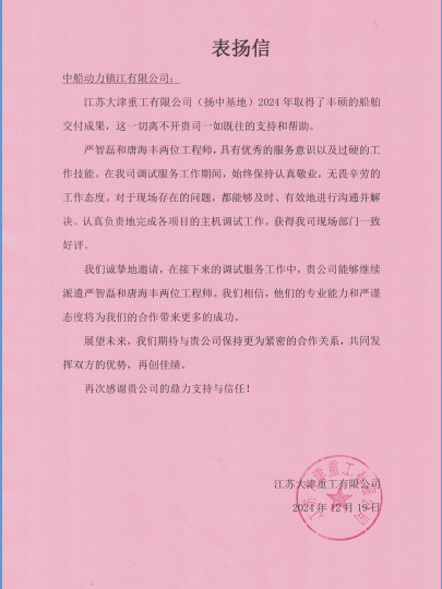 中船镇柴喜获多封顾客感谢信和表扬信